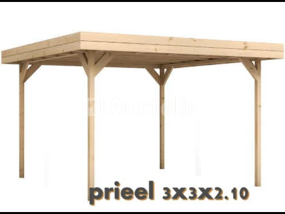1x Priëeltje, afmetingen circa 308x340cm., hoogte 210cm., afm. geschikt voor 6 panelen, inclusief bouwtekening bouten schroeven en bevestiging, exclusief voet (zie andere kavels) en dakplaten (worden zonne collectors niet bijgeleverd) afschot zelf te bepalen dmv staanders 9x9x2,10 inkorten, , dakbalken 4,5x14,5alles geïmpregneerd/gegalvaniseerd fotos zijn voorbeeldfotos