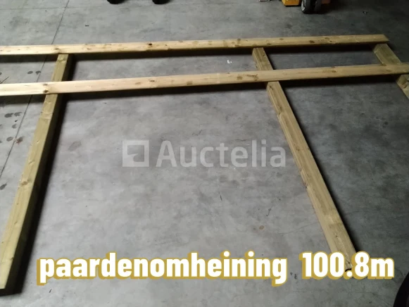 1x Paarden weide omheining, 100,8 meter, onder druk geïmpregneerd grenen, 57 palen van 270cm., 56 planken van 360cm., 480 schroeven. Let op! Dit is een bouwpakket