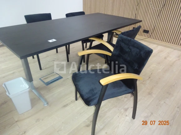 1 vergadertafel 200/100/75, 4 zwarte stoffen stoelen beukenkleurige armleuningen