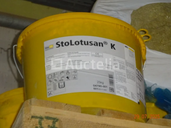 De inhoud van wat er op de rode plank (op de bovenste verdieping) ligt met uitzondering van de gemarkeerde partij, namelijk: 3 pallets waaronder 1 pallet van +- 10 zakken big mat bags, zakken grijs lijmcement, 1 pallet glaswol, 7 emmers van gele kleur, 1 pallet houtwol pavapex gs xl 1880x610x140, 1 dozijn steroïde panelen