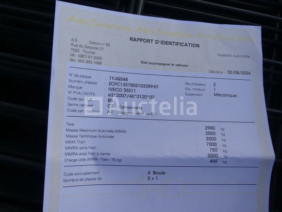 Bestelwagen Merk: Iveco Model: Dagelijks Jaar: 2016 Kilometerstand: 134234 Lengte: 700 cm Breedte: 200 cm Hoogte: 275 cm Gewicht: 2600 kg Vermogen: 78 kW Datum van 1e inschrijving: 15-08-16 Brandstof: Diesel Verplaatsing (cc) : 2287 Versnellingsbak: Handgeschakeld Airconditioning: Automaat Radio: Ja Achteruitrijcamera: Ja Aantal toetsen: 1 Aantal zitplaatsen: 3 Certificaat van overeenstemming: Ja Certificaat technische keuring: Ja Technisch keuringscertificaat geldig tot: : 18-08-25 Bewijs van inschrijving deel 1: Ja Bewijs van inschrijving deel 2: Ja Voertuig nog in dienst (kilometerstand evolueert): Nee Chassisnummer: ZCFC1357805103289 Euronorm: 5b Status: Functioneel op Inventarisatiedag