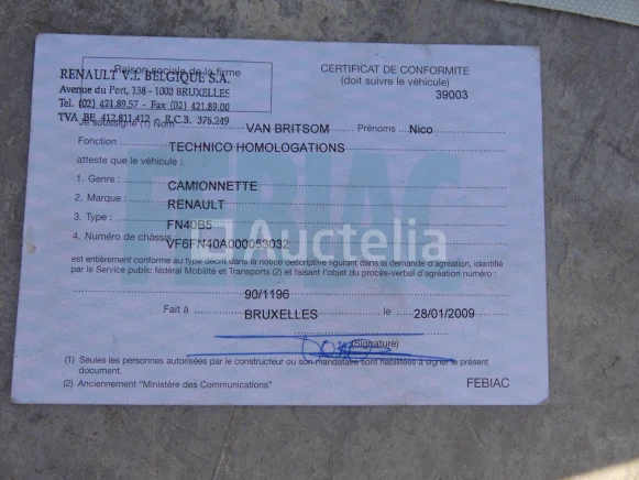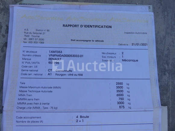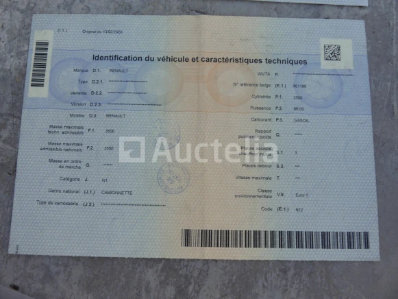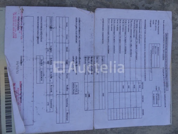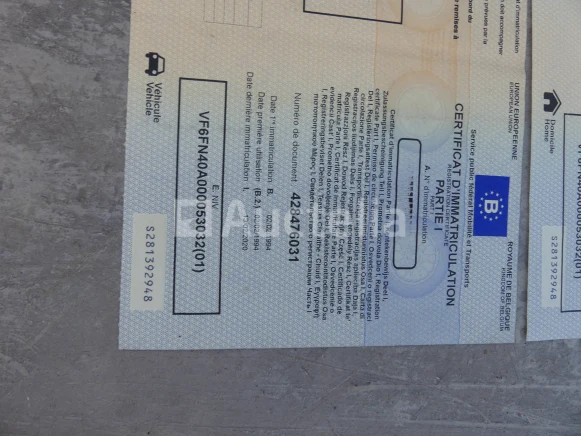 De vrachtwagen van de stortplaats Merk : Renault Artikelnummer: FN40B5 Jaar: 1994 Kilometerstand: 301415 Lengte: 543 cm Breedte: 205 cm Hoogte: 240 cm Gewicht: 255 kg Vermogen: 66 kW Datum van 1ste inschrijving : 02-02-94 Brandstof: Diesel Verplaatsing (cm³) : 2500 Versnellingsbak: Handgeschakeld Radio: Ja Aantal toetsen: 1 Aantal zitplaatsen: 3 Certificaat van overeenstemming: Ja Certificaat technische keuring: Ja Bewijs van inschrijving deel 1: Ja Bewijs van inschrijving deel 2: Ja Voertuig nog in dienst (kilometerstand evolueert): Nee Chassisnummer: VF6FN40A000053032 Euronorm: 1 Status: Functioneel op Inventarisatiedag Afmetingen van de kipper: 355 cm x 204 cm