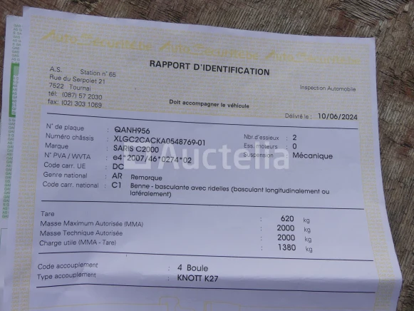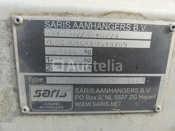 Kipper aanhanger Merk: Saris Model: C2C Lengte: 390 cm Breedte: 155 cm Hoogte: 165 cm MMA: 2000 kg Chassisnummer: XLGC2CACKA0548769 Afmetingen van de kipper: 270 cm x 150 cm x 90 cm