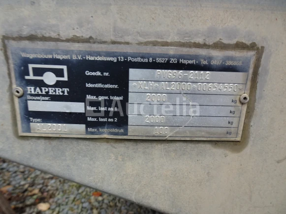Een dubbelassige geremde aanhanger Merk: HAPERT Model: AL2001 Chassis: XLHAL200000654550 Bouwjaar : 28/06/2002 MMA: 2000kg Documenten: Certificaat van Inschrijving & Certificaat van Overeenstemming