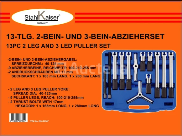 Trekker set 2 - en 3-armige dwarsarmen. Trekdiepte 105 - 210 mm en 265 mm, trekpoten zijn geschikt voor 2- en 3-poots dwarsbalken, trekkerbreedte tot 135 mm. Vrij bewegende poten maken inwendige en uitwendige trekhandelingen mogelijk, geharde trekvoeten (breedte ca. 25 mm, dikte ca. 4 mm), en 2 spillen ongeveer. 165 mm en 280 mm met schroefdraad M14 x 1,5 mm. Verwisselbare, speciaal geharde trek armen ( 25 mm breed, dikte 2 mm) Staat: nieuw