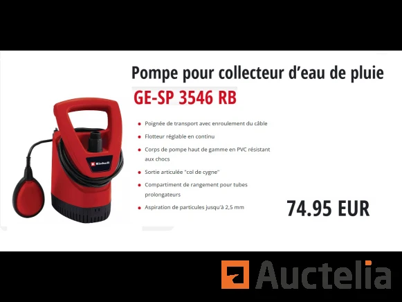 Pomp voor regenwateropvang Merk: EINHELL Model: GE-SP 3546 RB Vermogen: 350 W Opvoerhoogte: 11 m max Debiet: 4600 l/h max Conditie: Nieuw Verzending: Tarief B