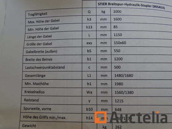 Hydraulische breedspoor vorkheftruck Merk: Stier Modelleer nr.: SFH10-W1.2M Jaar: 2022 Capaciteit: 1000 kg Hefhoogte: 1600mm Conditie: Nieuw