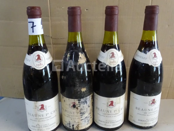 Beaune 1er Cru Les Cents-Vignes Aantal: 4 stuks Jaar: 1981 Let op: houten kist niet inbegrepen Verzending mogelijk op aanvraag (maar geen claim mogelijk in geval van breuk)
