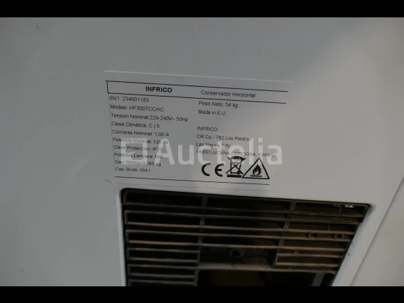Vriezer met schuifdeksel Merk: Infrico Model: HF300TCCHC Lengte: 107 cm Breedte: 67 cm Hoogte: 90 cm Gewicht: 54 kg Vermogen: 135 watt Aantal: 1 Getest: Nee Staat: Niet getest Opmerkingen: Aanbevolen bezoek