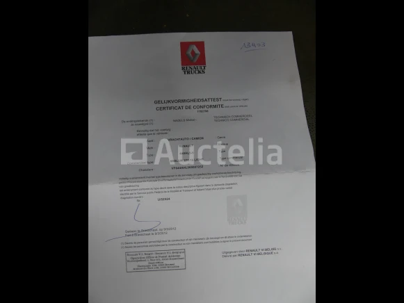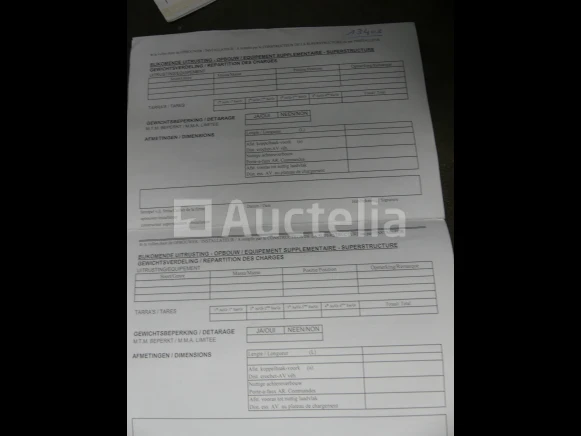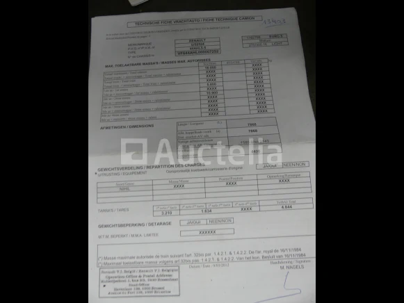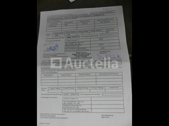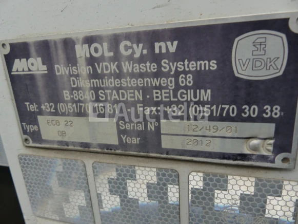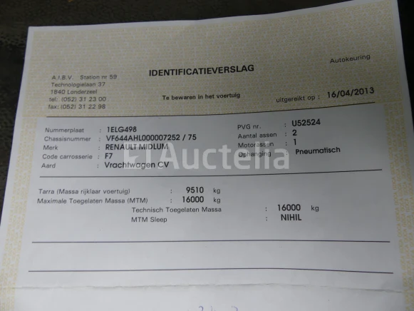 Vuilniswagen Merk : Renault Model: Midlum Jaar: 2013 Kilometerstand: 160268 Lengte: 800 cm Breedte: 255 cm Hoogte: 320 cm Vermogen: 195 kW Datum van 1e inschrijving: 11-01-13 Brandstof: Diesel Verplaatsing (cc³) : 7146 Versnellingsbak: Handgeschakeld MMA: 16000 kg Ledig gewicht: 9510 kg Wielbasis: 440 cm Ophanging: Pneumatisch Radio: Ja Aantal toetsen: 2 Aantal zitplaatsen: 6 Certificaat van overeenstemming: Ja Certificaat technische keuring: Ja Technisch keuringscertificaat geldig tot: : 16-04-26 Bewijs van inschrijving deel 1: Ja Gegevensblad vrachtwagen : Ja Identificatierapport: Ja Voertuig nog in dienst (kilometerstand evolueert): Nee Chassisnummer: VF644AHL000007252 Euronorm: 5 Interne verkoper nummer (Ref) : 8403 Status: Functioneel op Inventarisatiedag