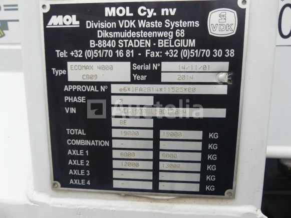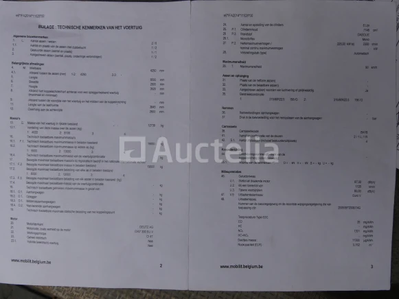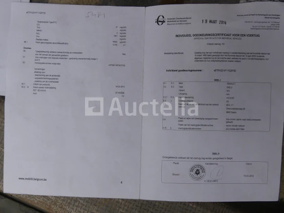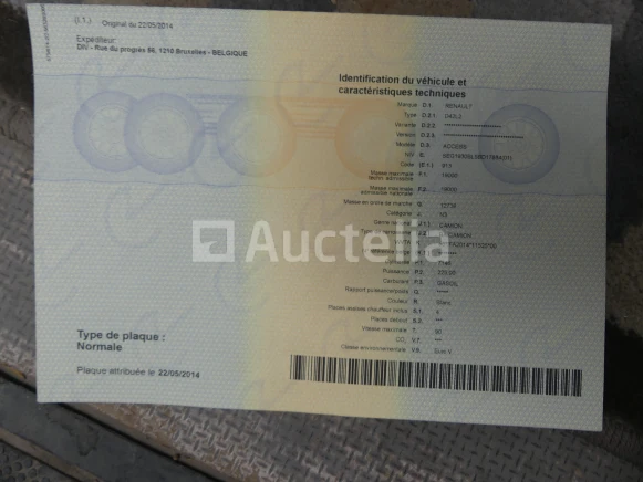 Vuilniswagen Merk : Renault Model: Toegang Jaar: 2014 Kilometerstand: 281264 Lengte: 860 cm Breedte: 255 cm Hoogte: 352 cm Vermogen: 225 kW Datum 1e inschrijving: 22-05-14 Brandstof: Diesel Verplaatsing (cc³) : 7146 Versnellingsbak: Automaat MMA: 19000 kg Ledig gewicht : 12380 kg Ophanging: Pneumatisch Radio: Ja Aantal toetsen: 1 Aantal zitplaatsen: 4 Certificaat van overeenstemming: Ja Certificaat technische keuring: Ja Technisch keuringscertificaat geldig tot: : 03-06-26 Bewijs van inschrijving deel 1: Ja Bewijs van inschrijving deel 2: Ja Identificatierapport: Ja Voertuig nog in dienst (kilometerstand evolueert): Nee Chassisnummer: SEG1930BL5BD17884 Euronorm: 5 Interne verkoper nummer (Ref) : 62481 Status: Functioneel op Inventarisatiedag Opmerkingen: Achterste steekblok, voorste veerbus, trekstangarm en cardanas te vervangen