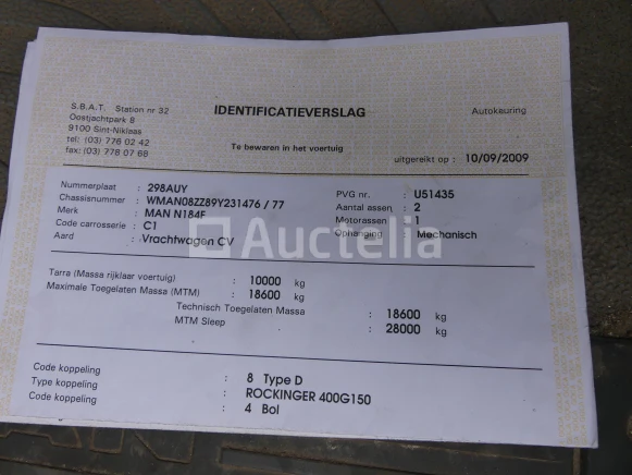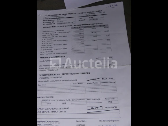 De vrachtwagen van de stortplaats met kraan Merk: MAN Artikelnummer: TGM 18.240 Jaar: 2009 Lengte: 765 cm Breedte: 255 cm Hoogte: 350 cm Vermogen: 176 kW Datum van 1ste inschrijving : 29-07-09 Brandstof: Diesel Verplaatsing (cc) : 6871 Versnellingsbak: Handgeschakeld MMA: 18600 kg Ledig gewicht: 10000 kg Wielbasis: 412 cm Ophanging: Mechanisch Radio: Ja Aantal toetsen: 2 Aantal zitplaatsen: 2 Certificaat van overeenstemming: Ja Certificaat technische keuring: Ja Technisch keuringscertificaat geldig tot: : 10-09-25 Bewijs van inschrijving deel 1: Ja Gegevensblad vrachtwagen : Ja Identificatierapport: Ja Voertuig nog in dienst (kilometerstand evolueert): Nee Chassisnummer: WMAN08ZZ89Y231476 Euronorm: 4 Intern verkopersnummer (Ref) : 10231 Staat: Niet getest Kraanvogel Merk: Terex Model: TLC 92.2 Jaar: 2009 Opmerkingen: Stuurprobleem, niet meer achteruitrijden