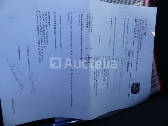 Vuilniswagen Merk : Renault Model: Midlum 270DXI Jaar: 2011 Kilometerstand: 189728 Lengte: 834 cm Vermogen: 195 kW Datum 1e inschrijving: 04-10-11 Brandstof: Diesel Verplaatsing (cc³) : 7146 Versnellingsbak: Automaat MMA: 16000 kg Tarra: 10270 kg Aantal toetsen: 1 Zitplaatsen: 7 Certificaat van overeenstemming: Ja Certificaat technische keuring: Ja Technisch keuringscertificaat geldig tot: : 26-04-25 Bewijs van inschrijving deel 1: Ja Gegevensblad vrachtwagen : Ja Identificatierapport: Ja Voertuig nog in dienst (kilometerstand evolueert): Nee Chassisnummer: VF644AHL000006203 Euronorm: 5 Interne verkoper nummer (Ref) : 1387 Staat: Niet getest Het voertuig startte tijdens de inventarisatie Rollen bij pick-up Geleverd zonder kenteken Aanbevolen bezoek Bekende gebreken: Injectie-indicatielampje (te herzien) Opmerkingen: Het voertuig heeft tijdens de inventarisatie geen grondige inspectie ondergaan en kan niet-zichtbare gebreken vertonen De koper wordt verondersteld het kavel vóór zijn veiling te hebben bezocht om de mogelijke afhandeling voor het ophalen van zijn aankoop te plannen