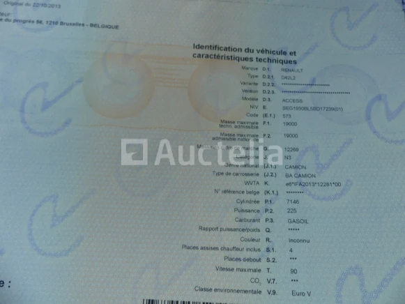 Vuilniswagen Merk : Renault Model: Toegang Jaar: 2013 Kilometerstand : 162300 Vermogen: 225 kW Datum van 1ste inschrijving : 22-10-13 Brandstof: Diesel Verplaatsing (cc³) : 7146 Versnellingsbak: Automaat MMA: 19000 kg Tarra: 12269 kg Ophanging: Pneumatisch Aantal toetsen: 1 Aantal zitplaatsen: 4 Certificaat van overeenstemming: Ja Certificaat technische keuring: Ja Technisch keuringscertificaat geldig tot: : 22-11-25 Bewijs van inschrijving deel 1: Ja Bewijs van inschrijving deel 2: Ja Gegevensblad vrachtwagen: Nee Identificatierapport: Ja Voertuig nog in dienst (kilometerstand evolueert): Nee Chassisnummer: SEG1930BL5BD17239 Euronorm: 5 Intern verkopersnummer (Ref) : 1436 Staat: Niet getest Het voertuig is niet gestart tijdens de inventarisatie Loopt niet bij het ophalen Geleverd zonder kenteken Aanbevolen bezoek Bekende gebreken: Lege batterij Startmotor te vervangen Achterbak te onderhouden Opmerkingen: Het voertuig heeft tijdens de inventarisatie geen grondige inspectie ondergaan en kan niet-zichtbare gebreken vertonen De koper wordt verondersteld het kavel vóór zijn veiling te hebben bezocht om de mogelijke afhandeling voor het ophalen van zijn aankoop te plannen