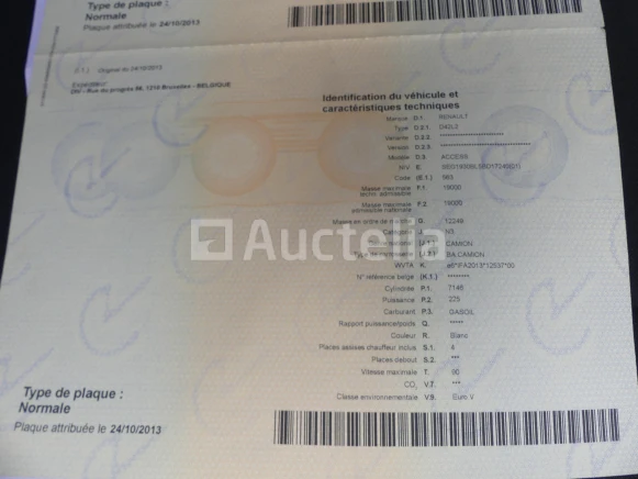 Vuilniswagen (op te knappen) Merk : Renault Model: Toegang Jaar: 2013 Kilometerstand : 185600 Vermogen: 225 kW Datum 1e inschrijving: 24-10-13 Brandstof: Diesel Verplaatsing (cc³) : 7146 Versnellingsbak: Automaat MMA: 19000 kg Ledig gewicht : 12190 kg Ophanging: Pneumatisch Aantal toetsen: 1 Aantal zitplaatsen: 4 Certificaat van overeenstemming: Ja Certificaat technische keuring: Ja Technisch keuringscertificaat geldig tot: : 02-12-25 Bewijs van inschrijving deel 1: Ja Bewijs van inschrijving deel 2: Ja Gegevensblad vrachtwagen: Nee Identificatierapport: Ja Voertuig nog in dienst (kilometerstand evolueert): Nee Chassisnummer: SEG1930BL5BD17240 Euronorm: 5 Intern verkopersnummer (Ref) : 3438 Staat: op te knappen Het voertuig is niet gestart tijdens de inventarisatie Loopt niet bij het ophalen Geleverd zonder kenteken Aanbevolen bezoek Bekende gebreken: Lege batterij Elektrisch probleem met de versnellingspook (onmogelijk om te starten) Opmerkingen: Het voertuig heeft tijdens de inventarisatie geen grondige inspectie ondergaan en kan niet-zichtbare gebreken vertonen De koper wordt verondersteld het kavel vóór zijn veiling te hebben bezocht om de mogelijke afhandeling voor het ophalen van zijn aankoop te plannen
