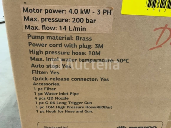 380V Motor: 4000W Max. Flow: 14L/min Max. pressure: 200 Bar Max. intel water temp: 50 graden Stroomkabellengte: 3M Autostop Filter Hogedrukslang 10M Spuitkop