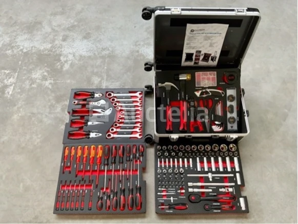Aluminium: ja; met inhoud: ja; omschrijving: 238 delig; w.o. steek- ringsleutel met ratel; diverse tangen; doppenset met ratel; diverse schroevendraaiers; precisieschroevendraaiers; inbussleutel; diverse bits; klauwhamer; schaar; rolmaat; waterpas; tapijtmes;