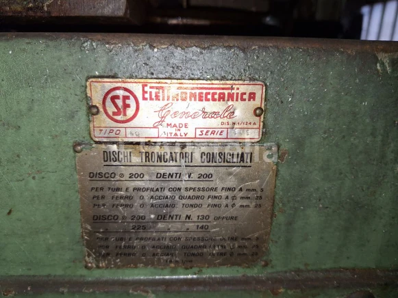 Cirkelzaag voor ijzer Merk: ELECTROMECANICA Soort: 60 Serie: 101 Motor: 1,5 pk, 1500 tpm, slechts 220 V driefasig Met pomp, met rollen aan de voorkant Standaard met 1 snelheid Met ondeugden, links-rechts afstuderen