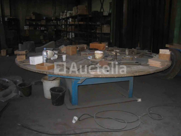 Handmatige draaitafel Gewicht: ±600kg, Externe afmetingen: Ø3070mm, Hoogte: 800mm; Afmetingen voet: L = 1500 mm, breedte: 1400 mm Draait op 1 as houten top
