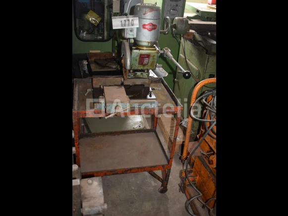 Cirkelzaag voor metalen Merk: EISELE Type: VM S1, Bouwjaar: 1966, Serienummer: V16076, MOTOR: Type NFU 55/4 220/380V lemmet diameter 225mm, snijcapaciteit 70 mm, gemonteerd op een roltafel, Verstelbaar en gegradueerd