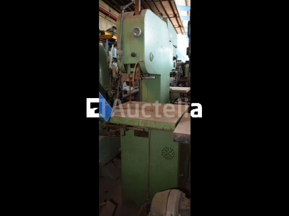 Verticale metalen lintzaag Merk: WESPA Type: 4 AS, Serienummer: 65 556 Externe afmetingen: 1150 mm x 900 mm, h. 2000 mm Motor: 1,5 kW, 220/380 V Instelbare eindeloze snelheid, gegradueerd Maximale doorvaarthoogte: 250 mm Doorlaat: 400 mm Bladlengte: 3200 mm, max. 3400 mm Met lamp en watergeefpomp Met apparaat voor het lassen van B 50 / 220 V bladen; 9 EEN