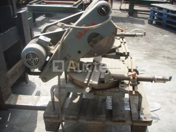 Cirkelzaag voor hout of aluminium Merk: ULMIA Soort: 1560 Bouwjaar: 1966 Gewicht: +- 170 kg Externe afmetingen: 1100 mm x 650 mm x 950 mm Motor, Merk DIETZ Soort: DR90S4 1,1 kW, 1400 tpm, 220 / 380 V Om op een werkbank te plaatsen WIDIA zaagblad Ø 300 mm Tafel Ø 450 mm Tafel draaibaar 45° aan 2 zijden Met dubbele pneumatische klemming