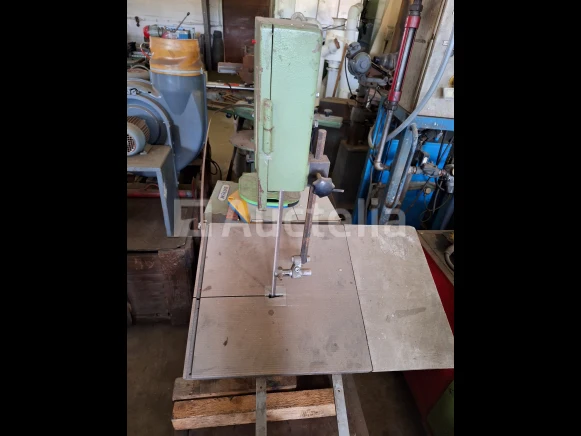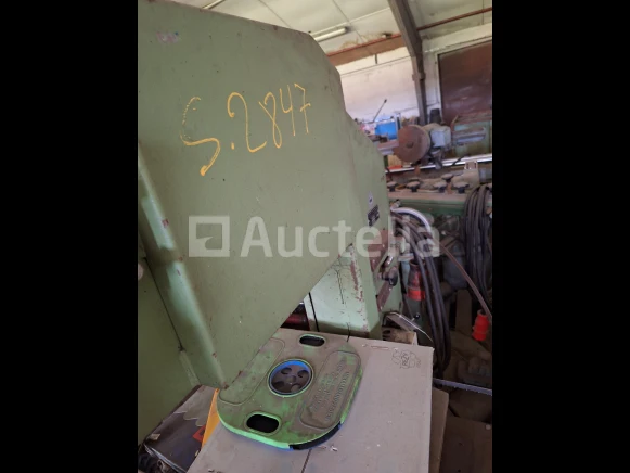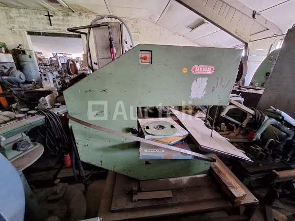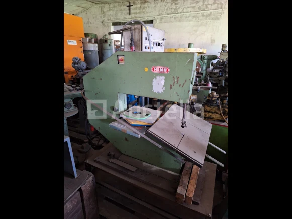 Kleine metalen lintzaag Merk: HEMA Type: BB315/3M Jaar: 1991 Externe afmetingen: 800 mm x 1500 mm, h. 1100 mm Tafel: 1000 mm x 700 mm Motor, merk SEW; 0,55/0,88 kW; Alleen 380V; 1380/2700 - 56/110 omw./min Motor met 2 versnellingen, Ø wielen 600 mm, nuttige breedte 580 mm Snijhoogte: 280 mm Kanteltafel, zonder CE-bescherming