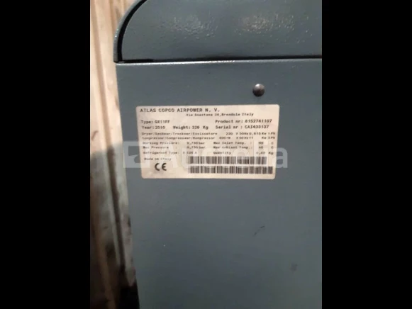 Compressor Merk: ATLAS COPCO Type: GX11FF Serienummer: CAI433137 / 8152741107 Bouwjaar: 2010 Externe afmetingen: lengte: 1500 mm; breedte: 650 mm; Hoogte: 1510mm Gewicht: 326kg Maximale luchtdruk: 9,75 bar Maximale temperatuur: 46°C