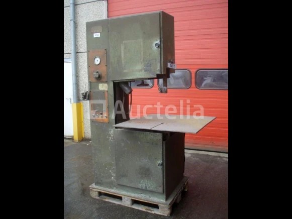 Verticale lintzaag Merk: LAMBERS Typ LV 63 Afmeting: Lengte 1580 mm, Breedte 1010 mm, Hoogte 2330 mm Tafelmaat: Lengte 1010 mm, Breedte 990 mm LEROY SOMER motor: 220/380 V, 5,5 PK, 1430 tpm Nuttig bereik: 610 mm Bruikbare hoogte: ± 400 mm Lengte lemmet 4600 mm. Snijsnelheid: 500 tot 1500 m/min