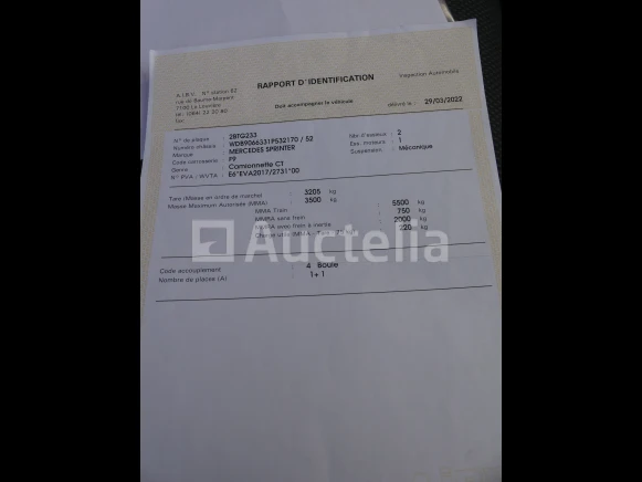 Vrachtauto met hoogwerker Merk: Mercedes-Benz Model: Sprinter 314 CDI Jaar: 2017 Kilometerstand: 154662 Vermogen: 105 kW Datum 1e inschrijving: 01-12-17 Brandstof: Diesel Verplaatsing (cc³) : 2143 Versnellingsbak: Handgeschakeld Airconditioning: Handmatig Radio: Ja Achteruitrijradar: Ja Aantal toetsen: 1 Aantal zitplaatsen: 2 Certificaat van overeenstemming: Ja Certificaat technische keuring: Ja Technisch keuringscertificaat geldig tot: : 22-07-26 Bewijs van inschrijving deel 1: Ja Bewijs van inschrijving deel 2: Ja Voertuig dat nog in dienst is (kilometerstand evolueert): Ja Chassisnummer: WDB9066331P532170 Euro Standaard: 6 Intern verkopersnummer (Ref) : 2700 Status: Getest Ledig gewicht : 3205 kg MMA: 3500 kg Voorzien van hoogwerker Merk: Versalift Model: ETL 36-135F Jaar: 2017 Het voertuig startte tijdens de inventarisatie Rollen bij pick-up Geleverd zonder kenteken Opmerkingen: Het voertuig heeft tijdens de inventarisatie geen grondige inspectie ondergaan en kan niet-zichtbare gebreken vertonen De koper wordt verondersteld het kavel vóór zijn veiling te hebben bezocht om de nodige apparatuur voor het ophalen van zijn aankoop te controleren en ter beschikking te stellen