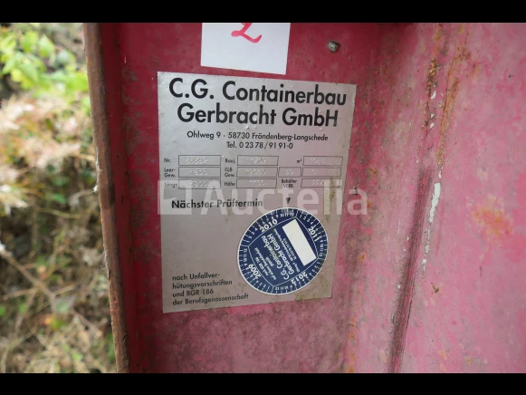 Materiaal container Merk: CG Containerbau Jaar: 2009 Lengte: 590 cm Breedte: 250 cm Hoogte: 110 cm Gewicht: 1800 kg Aantal: 1 Hoogte hijshaak: 160 cm Bruikbaar volume: 10,3 m³ Maximaal draagvermogen: 12000 kg Identificatienummer: 36552 Opmerkingen: Aanbevolen bezoek