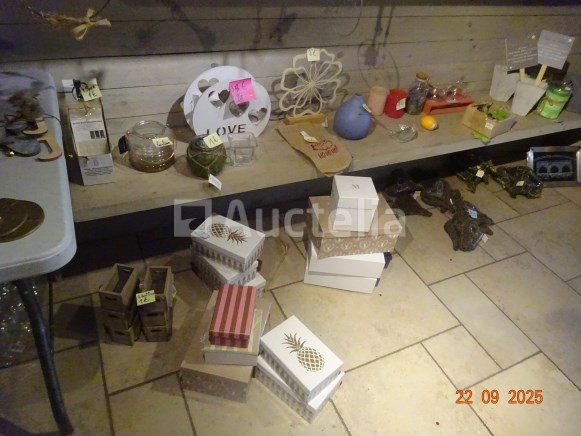 Voorraad inclusief 1 plank en zijn inhoud, 1 display met ansichtkaarten, kerstartikelen, diverse mokken, decoratieve artikelen, bloempotten, cadeauverpakkingen, diverse smeedijzeren displays