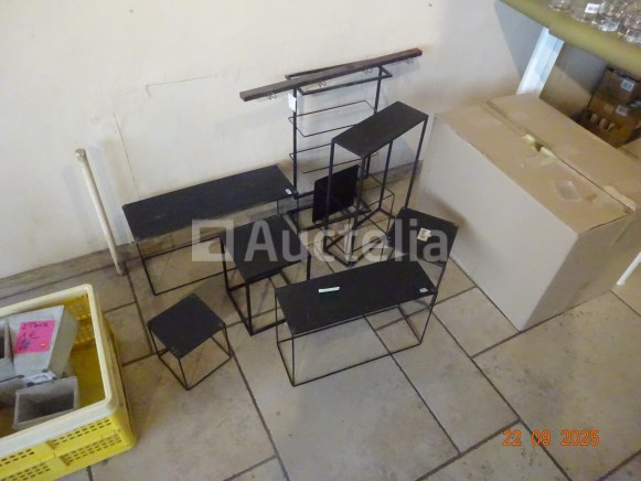 1 voorraad inclusief 1 plank en de inhoud, 1 display met ansichtkaarten, kerstartikelen, diverse mokken, decoratieve artikelen, bloempotten, cadeauverpakkingen, diverse smeedijzeren displays