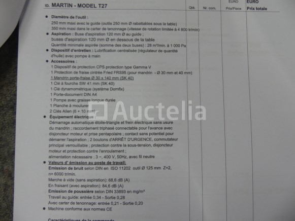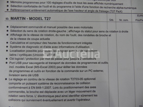 Freesmachine met kantelas Merk: Martin Model: T27 Flex Jaar: 2020 Spanning: 400V driefasig Lengte: 245 cm Breedte: 145 cm Hoogte: 180 cm Status: Functioneel op Inventarisatiedag Weinig gebruikt De freesmachine heeft tijdens de inventarisatie geen grondige inspectie ondergaan en kan niet-zichtbare gebreken vertonen