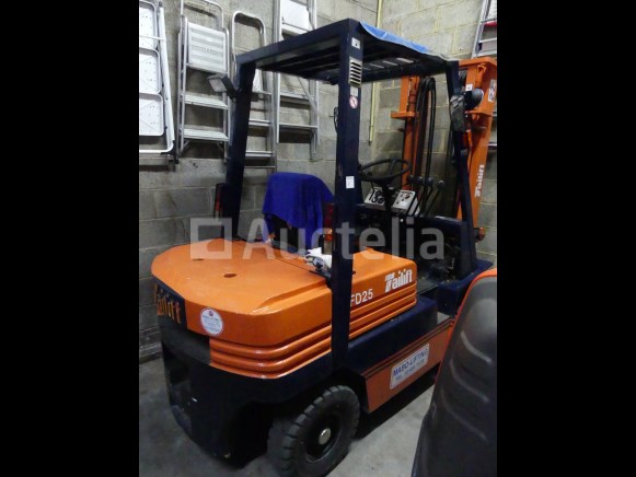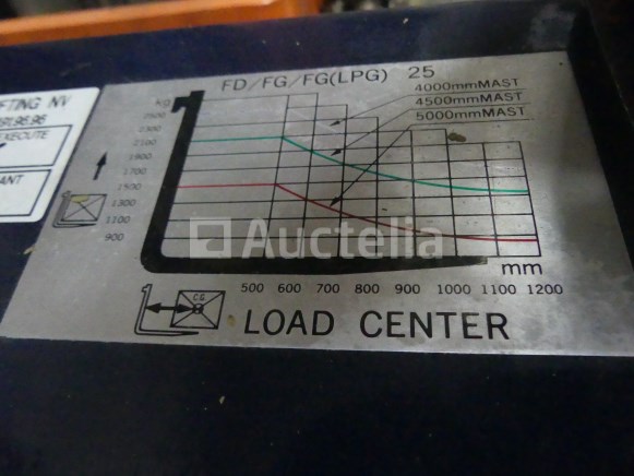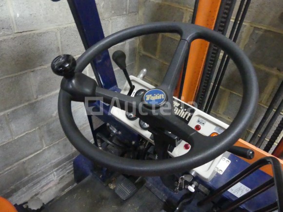 Vorkheftruck Merk: Tailift Model: FD 25 Jaar: 1996 Uren: 732 Lengte: 240 cm Breedte: 116 cm Hoogte: 225 cm Gewicht: 3800 kg Voortstuwing: Thermisch Hefvermogen: 2500 kg Vermogen: 37,5 watt Lengte vork: 115 cm Type mast: Duplex Hefhoogte: 350 cm Aantal wielen: 4 Status: Functioneel op Inventarisatiedag De kar heeft tijdens de inventarisatie geen grondige inspectie ondergaan en kan niet-zichtbare gebreken vertonen Met 200 cm vorkverlenging