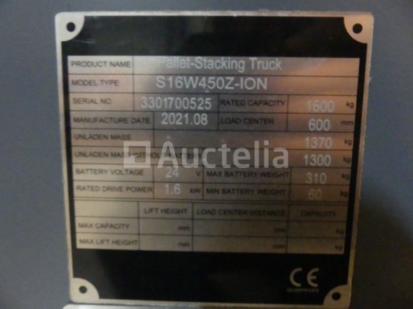 Stacker Merk: Climax Model: S16W450Z-ION Jaar: 2021 Uren: 8 Lengte: 210 cm Breedte: 90 cm Hoogte: 202 cm Voortstuwing: Elektrisch Hefvermogen: 1600 kg Lengte vork: 110 cm Type mast: Triplex Hefhoogte: 450 cm Status: Functioneel op Inventarisatiedag Weinig gebruikt De stapelaar heeft tijdens de inventarisatie geen grondige inspectie ondergaan en kan niet-zichtbare gebreken vertonen Opmerkingen: Afhaling op afspraak