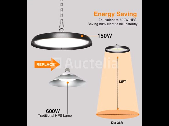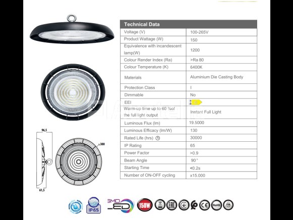5 x Highbay LED SLIM 150W – 6500K Cool White – Waterdichte UFO – Vermogen: 150W – Lichtstroom: 19.500 lumen – Kleurtemperatuur: 6.500K (koud wit) – IP-waarde: IP65 (dicht) – Inclusief DOB IC driver – Beamingshoek: 90° – Kleurweergave-index (IRC): 80 – Vermogensfactor: 0,95 – Spanning: 100-265V – Materialen: aluminium en PC – Afmetingen: Ø 290 x 70 mm – Kleur: zwart – Levensduur: 30 000 uur – Garantie: 2 jaar – Montageset niet inbegrepen.