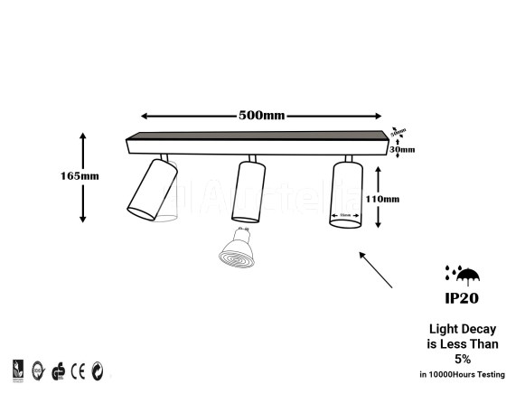 4 x opbouwarmatuur GU10 – 3 draaibare spots – Zwart – Kop: GU10 – Afmetingen: 500 x 165 mm – Richtbare spots: 350° rotatie en 70° helling – Hoogwaardig aluminium – Kleur: zwart – TensiAan: 85-265V (50/60Hz) – Beschermingsgraad: IP20 – Geschikt voor gebruik binnenshuis – GU10-lampen niet inbegrepen – Inclusief montageset – Ideaal voor accent-, werk- of decoratieve verlichting – Lange levensduur en premium design.
