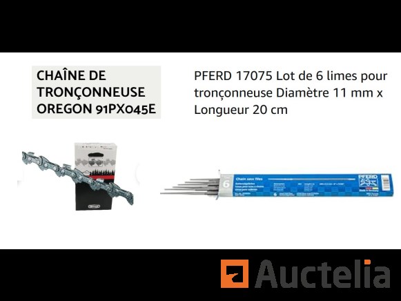 Kettingzaag Ketting Merk: OREGON Artikelnummer: 91PX045 Conditie: Nieuw Kettingzaag vijl Merk: PFERD Model: 17075 Aantal: 6 stuks Dimensie: . Doorsnede 11 mm . Lengte 20 cm Conditie: Nieuw Verzending: Tarief A
