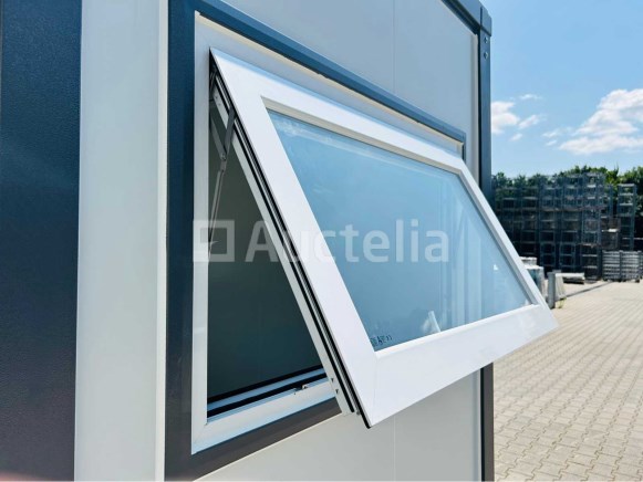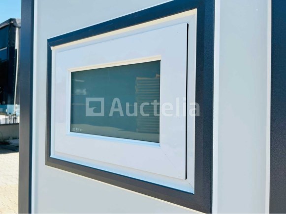 Afsluitbare deur; 3 kiep raam; stelbare poten; hijs oog; heftruck lepelsleuven; opstapje; vinyl vloer; wastafel; toilet; douche; kast; slaapbank; geïsoleerd; ventilator; aansluitingen aanwezig voor af- en aanvoer; 3970x2180x2450mm; 7409