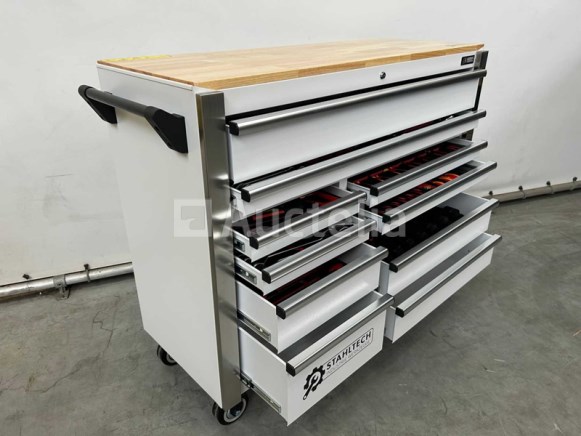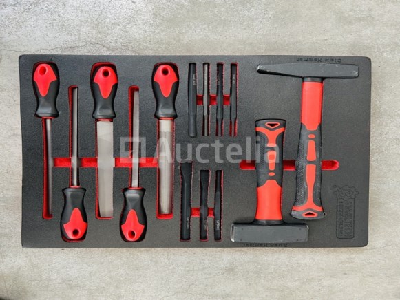 Ongebruikt; gereedschap in plastic verpakt; 12-delig tangenset; 13-delig hamerset; 14-delig meetset; 36-delig slagmoersleutel set; 21-delig sleutels met T-greep; 41-delig schroevendraaierset; 29-delig combinatiesleutels; 12-delig ringsleutels; 125-delig doppenset; 84-delig bitjes set; 7483