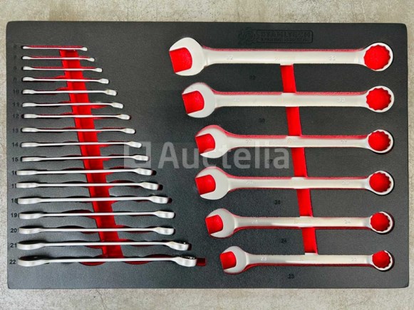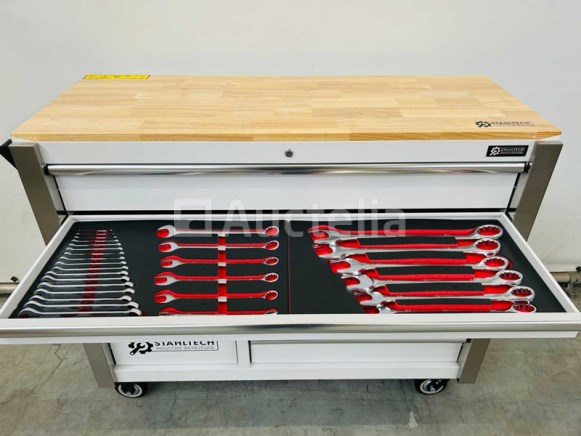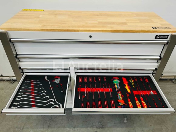 Ongebruikt; gereedschap in plastic verpakt; 12-delig tangenset; 13-delig hamerset; 14-delig meetset; 36-delig slagmoersleutel set; 21-delig sleutels met T-greep; 41-delig schroevendraaierset; 29-delig combinatiesleutels; 12-delig ringsleutels; 125-delig doppenset; 84-delig bitjes set; 7483