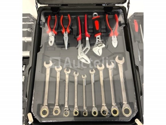 Aluminium: ja; met inhoud: ja; afmeting L: 210 mm; afmeting B: 370 mm; afmeting H: 520 mm; omschrijving: 186 delig; w.o. steek- ringsleutel met ratel; diverse tangen; doppenset met ratel; diverse schroevendraaiers; precisieschroevendraaiers; inbussleutel; diverse bits; klauwhamer; krimptang; schaar; rolmaat; waterpas; hetelijmpistool; kunststof klemmen; tapijtmes;