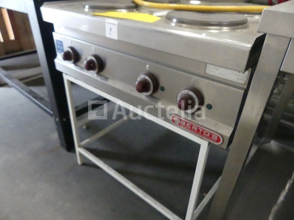 4-pits elektrisch fornuis Merk: Bertos Spanning: 400V driefasig Lengte: 80 cm Breedte: 72 cm Hoogte: 95 cm Staat: Niet getest Op steunpoten