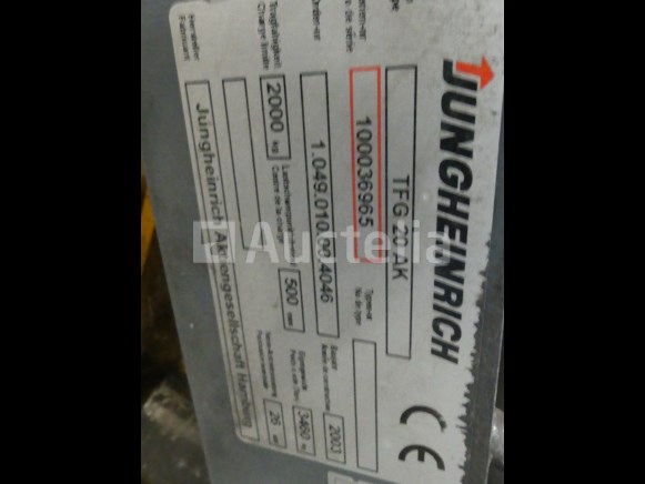 Gas vorkheftruck Merk: Jungheinrich Model: TFG20A Lengte: 360 cm Breedte: 120 cm Hoogte: 220 cm Gewicht: 3350 kg Voortstuwing: Gas Hefvermogen: 2000 kg Vermogen: 26 kW Lengte vork: 120 cm Type mast: Triplex Hefhoogte: 500 cm Aantal wielen: 4 Aantal: 2 Staat: op te knappen