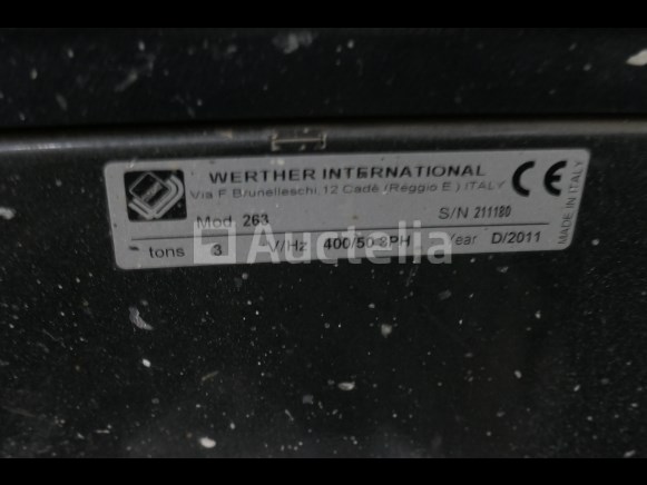 De Brug van de schaargarage Merk: Werther Model: 263 Jaar: 2011 Spanning: 400V driefasig Lengte: 170 cm Breedte: 178 cm Aantal: 1 Capaciteit: 3000 kg Getest: Ja Maximale hoogte: 96 cm Getest = Werd in beweging gezet toen hij leeg was Opmerkingen: Aanbevolen bezoek
