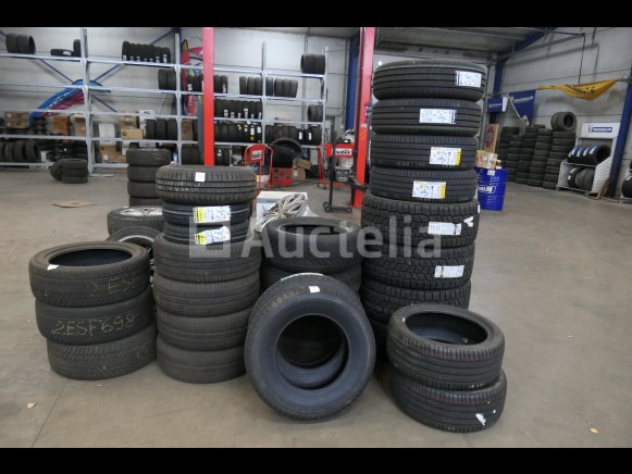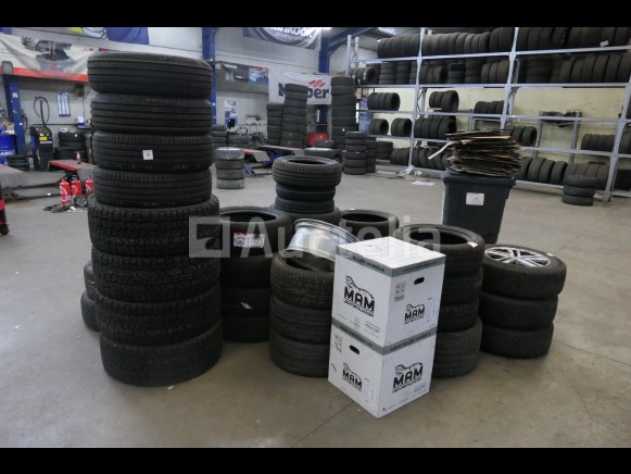 Kavel diverse banden van diverse merken en condities Sommige op velgen Geschatte hoeveelheid: +/- 35 Opmerkingen: Kavel opgeslagen op de grond in het midden van de garage