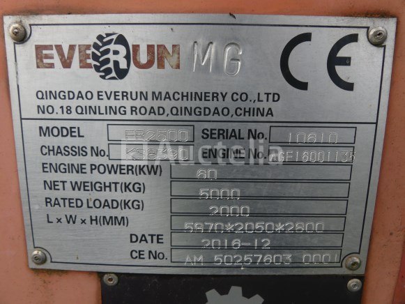 Wiellader Merk: Everun Model: ER2500 Jaar: 2016 Lengte: 600 cm Breedte: 205 cm Hoogte: 280 cm Gewicht: 5000 kg Capaciteit: 2500 kg Staat: Niet getest Geleverd met 2 bakken en vorken