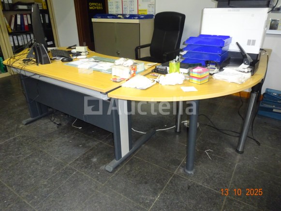 1 beige bureau, houten bovenste plank 1 hoekbureau 1 driedelig hoekbureau maat 220/260 1 kleine kast met twee lades 1 lederen directiestoel op wielen, chromen poten