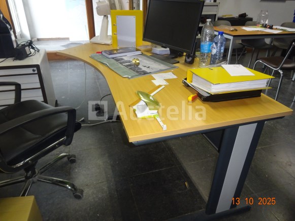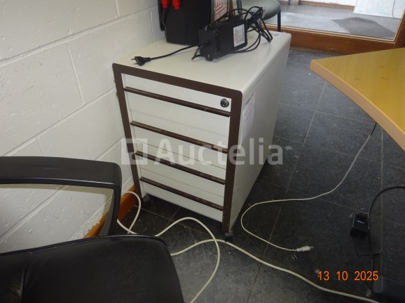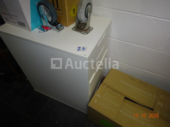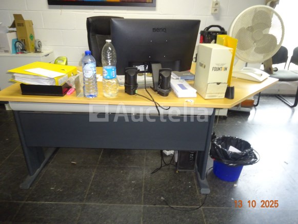 1 beige houten secretaresse op de bovenste plank Afmetingen: lengte 198 2 kleine witte kasten met vier lades 1 zwart lederen directiestoel op wielen, chromen poten